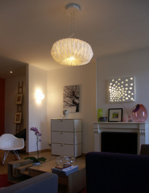 Abat-jour fait d'une seule feuille pliée. Origami de grand format. Matériau hydrofuge, nettoyable.